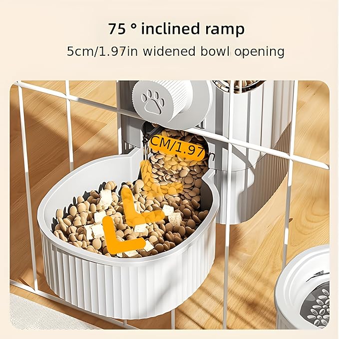 - Automatic Supply Design: Dog feeder automatically dispenses food and water by gravity, so that your dog can enjoy fresh and clean food and water at any time. And pet feeder can ensure that your cat can maintain a feeling of fullness when you go out or work. The opening of automatic cat feeder is designed with a 45 degree slope, and it has a large width of up to 2 inches. When your cat empties food bowl, the food will be dispensed smoothly and don’t be stuck.
