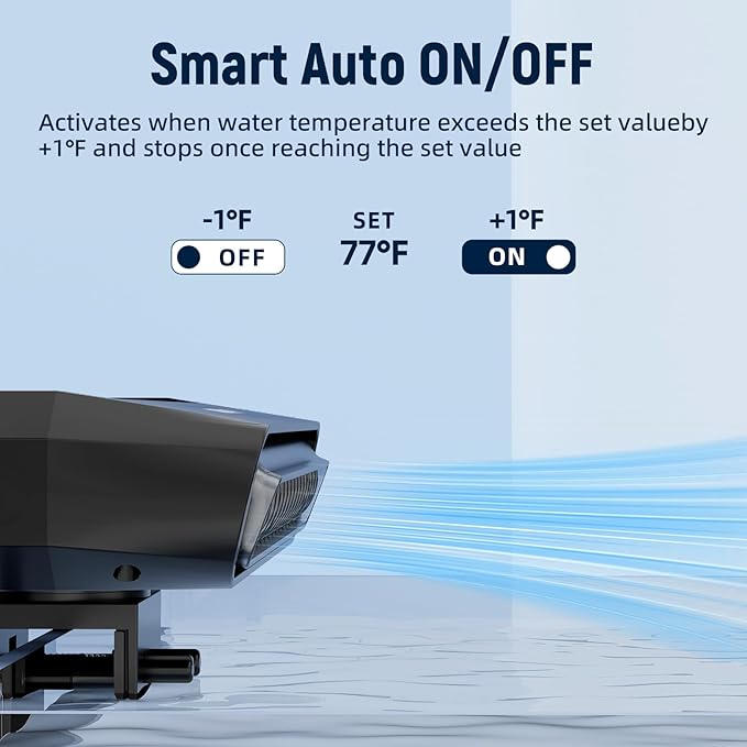 - 【Auto Start-Stop & Multi-Function】The aquarium cooler system features automatic mode with intelligent start/stop to maintain stable water temperature. It offers 3-Speed Airflow Adjustment,1st gear Ultra-quiet operation;2nd gear for 24/7 operation,3hd gear for extreme temperatures.The Independent Controller Prevents moisture damage to internal components. The ceramic temperature probe is compatible with both saltwater and freshwater environments.