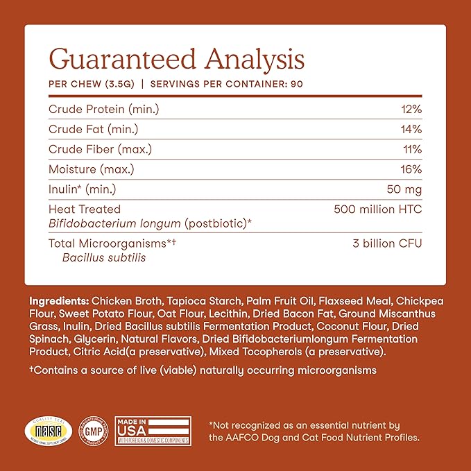 - Premium Traceable Ingredients That Go Beyond the Basics: Our dog chews are formulated with inulin from chicory root, sustainable miscanthus grass, and clinically studied Bacillus subtilis for effective, daily gut support; no fillers or artificial preservatives