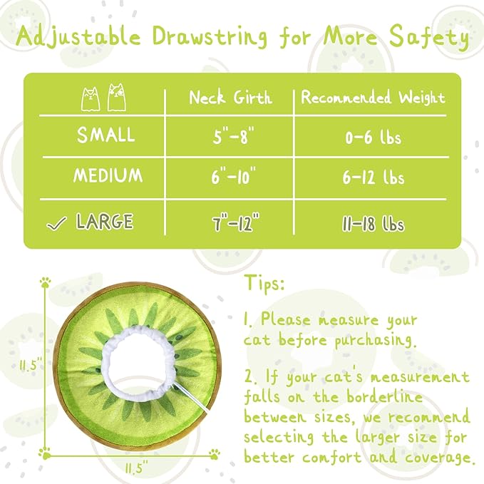 • 【SUITABLE FOR ALL SIZE OF CATS】 Soft cone for cats has an adjustable inner, so you can make a comfortable fit for your cat. By adjusting the stretchy string, cat won’t slip out of it that easily. Available in three sizes. Size L (11.5"×11.5") suitable for cats with a neck circumference of 7-12 inches (11-18 pounds cats recommended).