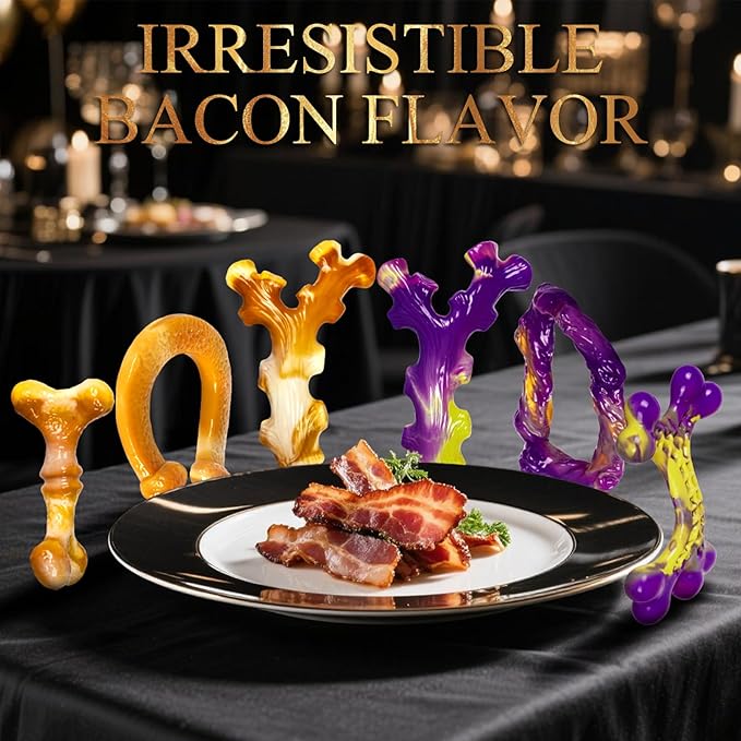 - AUTHENTIC BACON ESSENCE · IRRESISTIBLE BY DESIGN Our 6-pack features real bacon-infused nylon, specially crafted for large breeds. Watch as the savory aroma captivates your pup’s senses, transforming idle energy into focused play.