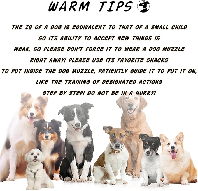 - WEARING INSTRUCTIONS: the dog's IQ is equivalent to that of a small child, so please be patient and guide it to put on the dog muzzle, do not force it to put it on right away, please use the snacks it likes to eat as a reward, slowly let it accept