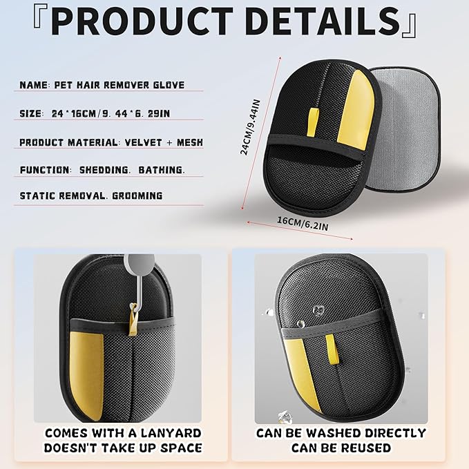 - 【Electrostatic Pet Hair Remover】The double-sided design of the Electrostatic Pet Hair Remover can quickly and effectively remove loose hair from your pet, making the cleaning work faster and more thorough. The hair will stick to the gloves, making cleaning a breeze. This static pet hair remover is larger than most pet gloves (9 inches x 6.7 inches), covering a larger area in a shorter time, making cleaning more convenient.