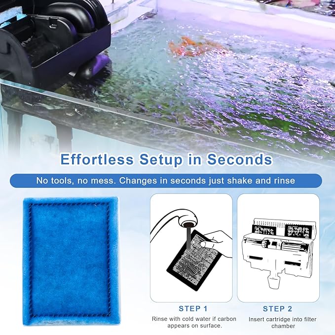 - 【Effortless Setup in Seconds】Slide the pre-assembled fish filters for aquariums under cool water to rinse away carbon dust, align its keyed base, and push it straight into the aquarium filter chamber until it clicks—done. No tools, no mess, just shake, rinse, and enjoy fresh filtration in seconds.