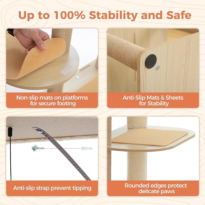 - Ultimate Stability & Cat-Safe Engineering: This tall cat tower is designed with non-slip pads on every platform, rounded corners to prevent injuries, an anti-tip chain, and floor-protecting base pads, ensuring wobble-free security and safety.