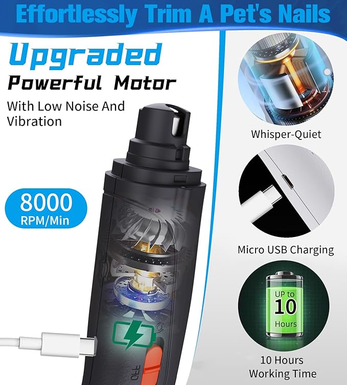 - 【⚡Type-C USB Rechargeable - Long Battery Life】our pet paw trimmer abandoned traditional special charging port, any type-C cable can charge the grinder fast. Save lots of money for buying extra charging cable. And the large capacity battery runs up to 4 hours after a refill, filing down at least 20 dogs at a charge.【Attention ! 30-day free replacement for any problem and 1 year warranty!】