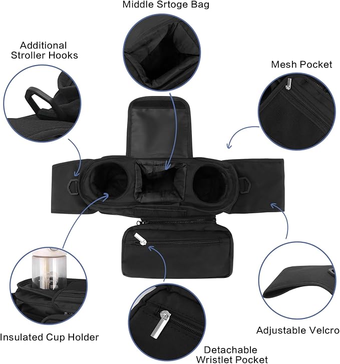 - Insulated cup holder: Dog stroller bag is equipped with two insulated cup holders, which can hold 2 water bottles. This ensures that you and your pet stay hydrated outdoors. The cup holder design allows the cups to be placed upright, effectively preventing spills and providing a thoughtful touch to your travel experience.