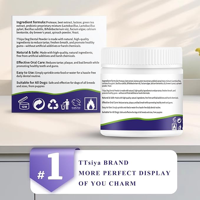 - EFFORTLESS ORAL CARE: No brushing required! Simply add TTsiya’s easy-to-use dental powder to your pet’s food for fresher breath and healthier gums. Perfect for pets that dislike traditional brushing, this powder ensures thorough cleaning without the hassle of toothpaste or toothbrushes.