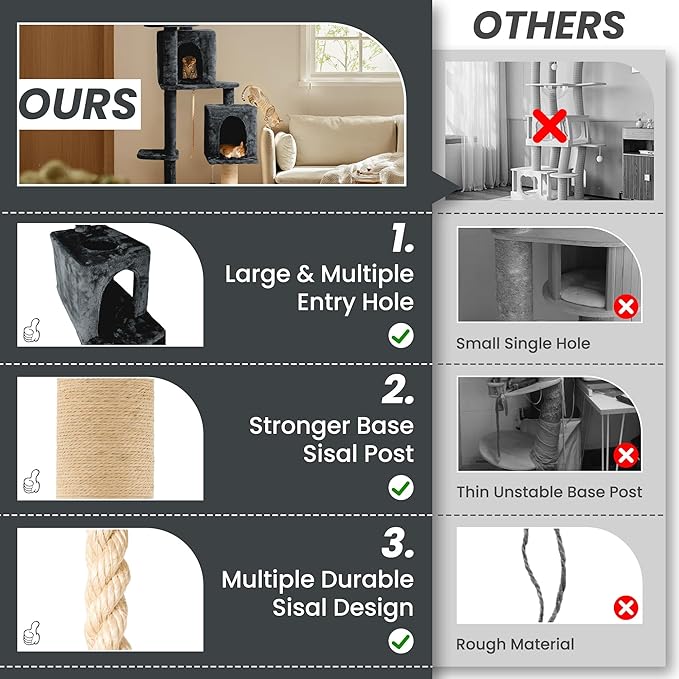- 🐾[Spacious and comfortable Design]: 59 inch ultra large size cat tree, equipped with two independent cat condos, providing ample space for multiple cats to move and rest.