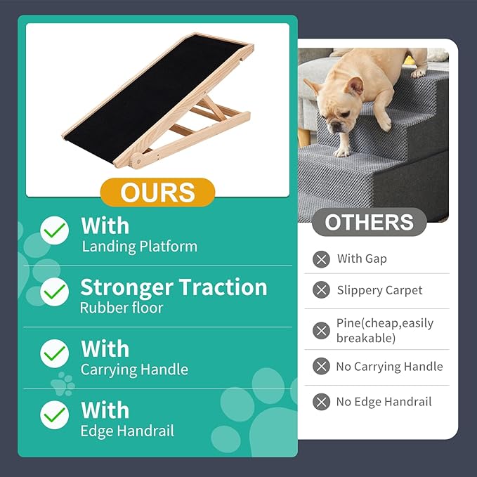 - STURDY & DURABLE: Our dog ramp for dogs and cats is specially made very well - solid wood construction and sturdy stainless steel fasteners, which has been tested to support up to 200lbs. When they jump off the bed, sofa, and sofa, there is no need to worry about getting injured, which provides safety for your pet.